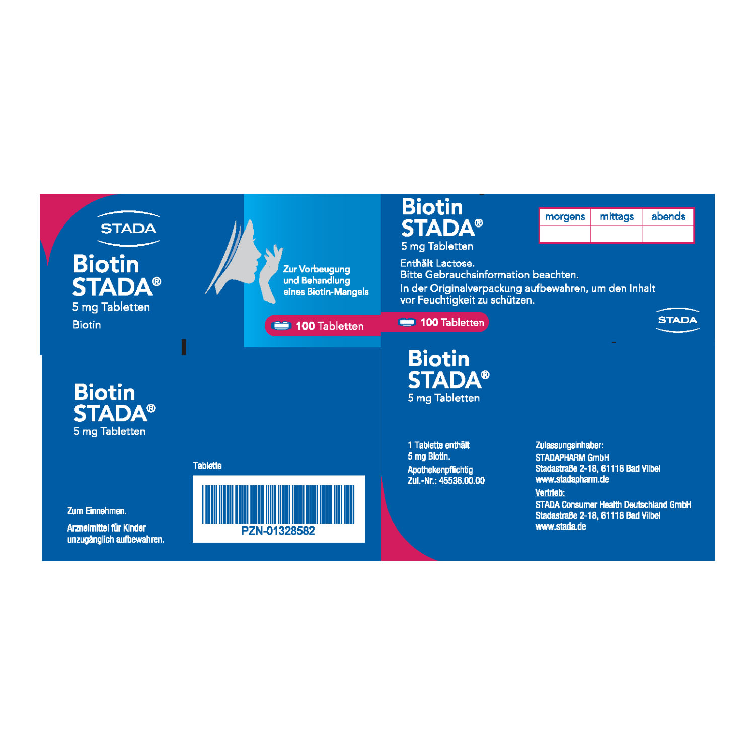 Anwendungsgebiete: Prophylaxe und Therapie von Biotin-Mangelzuständen. (Zur Prophylaxe sind weniger als 0,2 mg Biotin am Tag ausreichend) zusätzlich für Biotin STADA 5 mg: Therapie von Biotin-Mangelzuständen beim sehr seltenen Biotin-abhängigen, multiplen Carboxylasemangel.