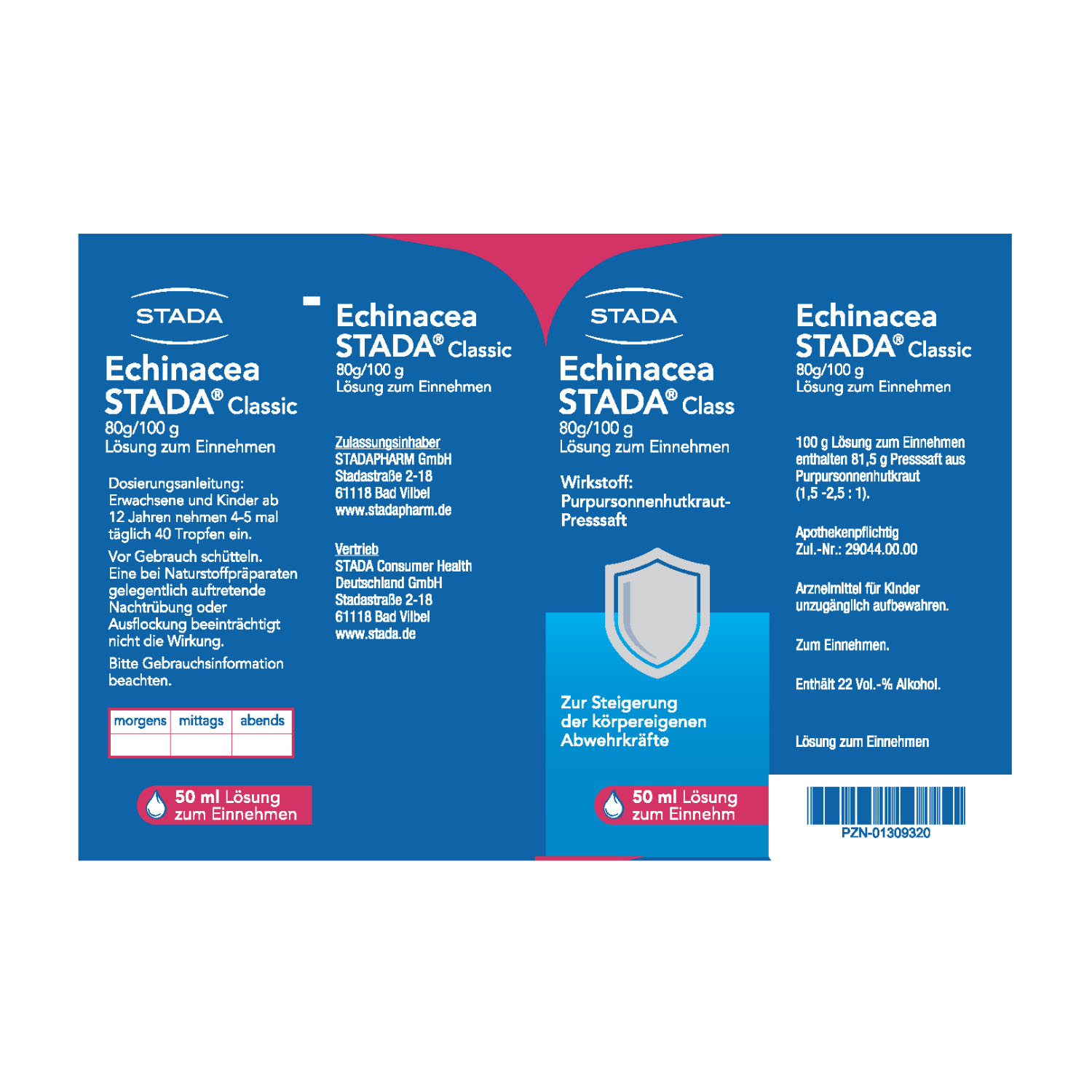 Erwachsene und Kinder ab 12 Jahren nehmen 4 bis 5-mal täglich 40 Tropfen ein. Die Lösung kann unverdünnt oder in Flüssigkeit eingenom- men werden. Vor Gebrauch schütteln. Eine bei Naturstoffpräparaten gelegentlich auftretende Nachtrübung oder Ausflockung beeinträch- tigt nicht die Wirkung. Bei der Einnahme von Echinacea STADA® Classic muss beachtet werden, dass die Lösung 22 Vol.-% Alkohol enthält.