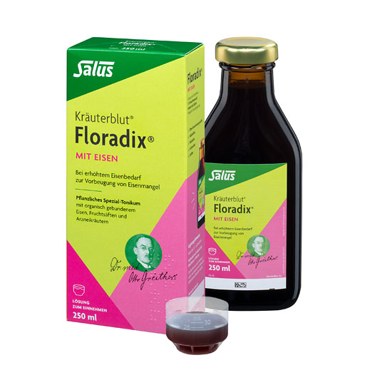 Soweit nicht anders verordnet, nehmen Erwachsene und Heranwachsende ab 10 Jahren 3-mal 15 ml pro Tag mit dem beiliegenden Messbecher ein. 45 ml FLORADIX® MIT EISEN enthalten 36,8 mg verwertbares Eisen(II).