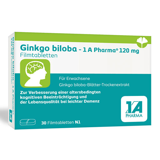 Ginkgo biloba - 1 A Pharma mit einen Trockenextrakt aus Ginkgo biloba-Blättern ist ein pflanzliches Arzneimittel zur Verbesserung einer altersbedingten kognitiven Beeinträchtigung und der Lebensqualität bei leichter Demenz.