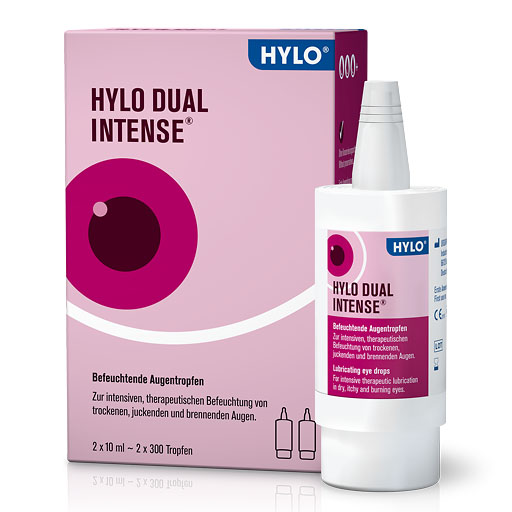 HYLO DUAL INTENSE® enthält mit 0,2 % eine besonders hohe Konzentration an Hyaluronsäure und ist hochviskos. Dadurch wird das Auge besonders intensiv und nachhaltig mit einem stabilen Feuchtigkeitsfilm versorgt. Mit HYLO DUAL INTENSE® werden somit anhaltende oder stärkere, sogar chronische Beschwerden gelindert und das Auge dauerhaft vor Reizungen geschützt.