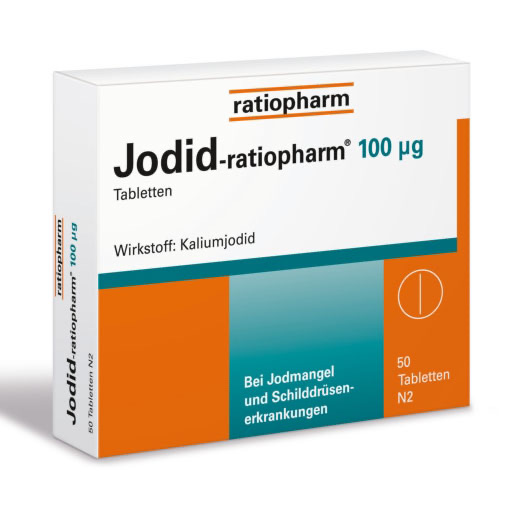 Jodid-ratiopharm® 100 µg Tabletten Wirkstoff: Kaliumjodid Anwendungsgebiete: Vorbeugung eines Jodmangels. Behandlung eines Kropfes bei Neugeborenen, Kindern, Jugendlichen und jüngeren Erwachsenen. Warnhinweis: Tabletten enthalten Lactose-Monohydrat. Apothekenpflichtig.