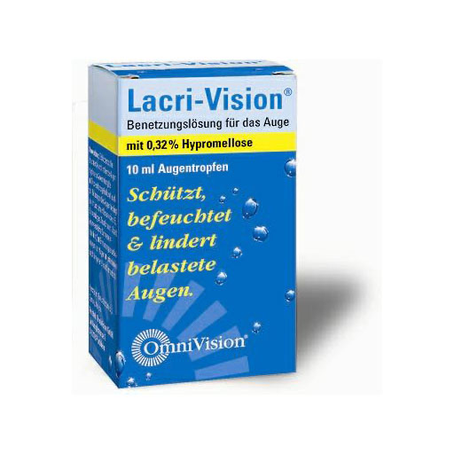 Lacri-Vision® erfrischt und beruhigt belastete Augen und erhöht ihre Gleitfähigkeit. Lacri- Vision® hat eine schützende, befeuchtende Wirkung, die Trockenheitsgefühl auf Grund von Umwelteinflüssen, wie z.B. Klimaanlagen, Tabakrauch, Staub, Reizungen durch Sonneneinstrahlung oder Müdigkeit sowie lange Bildschirmarbeit, rasch und lang anhaltend lindert. Die viskositätserhöhende Substanz Hypromellose bildet auf dem Auge einen optisch klaren Schutz- und Gleitfilm, der die physiologischen Funktionen der fehlenden Tränenflüssigkeit übernimmt.