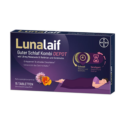 Lunalaif® Guter Schlaf Kombi Depot enthält 1,9 mg Melatonin. 1 mg davon wird etwa 30 Minuten nach der Einnahme freigesetzt. Das erhöht die Schlafbereitschaft und man schläft schneller ein. Gleichzeitig werden 80 mg Goldmohnextrakt und 90 mg Baldrianextrakt an den Körper abgegeben. Beide Pflanzen wirken entspannend und unterstützen die Schlafqualität.