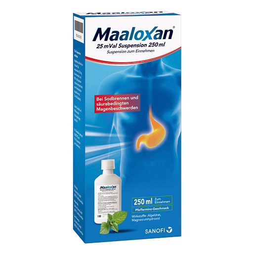 Hinweise: Nicht bei Kindern unter 12 Jahren anwenden. Beschwerden, die länger als 2 Wochen bestehen, klinisch abklären lassen. -25 mVal Suspension enthält Sorbitol, Pfefferminzöl, Methyl-4-hydroxybenzoat und Propyl-4-hydroxybenzoat (Parabene). -25 mVal Suspension 250 ml enthält Sorbitol, Pfefferminzöl und Domiphenbromid. Die Einnahme anderer Arzneimittel sollte grundsätzlich mindestens 2 h vor oder nach Einnahme von Maaloxan Suspension erfolgen.