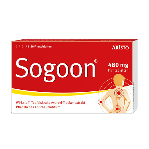 Bei Arzneimittel Sogoon® Filmtabletten handelt es sich um ein pflanzliches Antirheumatikum. Die rezeptfreien Filmtabletten sind zugelassen zur unterstützenden Therapie bei Verschleißerscheinungen des Bewegungsapparates. Sie hemmen Entzündungen und können die Schmerzen bei Gelenkverschleiß lindern. Eine Filmtablette enthält 480 Milligramm Trockenextrakt aus der Teufelskrallenwurzel. Wichtig: Die Wirkung der Tabletten tritt nicht sofort ein. Doch nach wenigen Tagen regelmäßiger Einnahme können Sogoon® Filmtabletten die Beschwerden spürbar lindern.